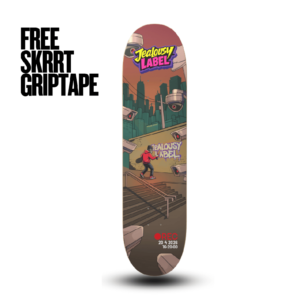The Under Surveillance skateboard deck by Jealousy Label captures the raw reality of street skateboarding — where every move is watched and every spot comes with pressure. Inspired by real city sessions, this graphic features a skater caught on camera tagging Jealousy Label while surrounded by security cameras, with Graffiti Ned making his appearance in the chaos.
